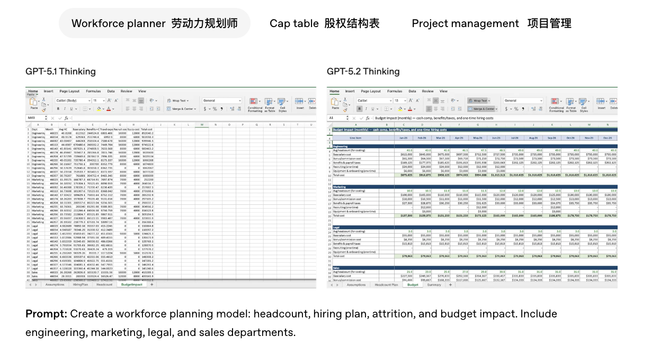 OpenAI给出的示例显示,GPT‑5.2 Thinking在制作人力资源规划模型、股权结构表和项目管理表格的任务中,产出成果较GPT‑5.1 Thinking有肉眼可见的进步。
