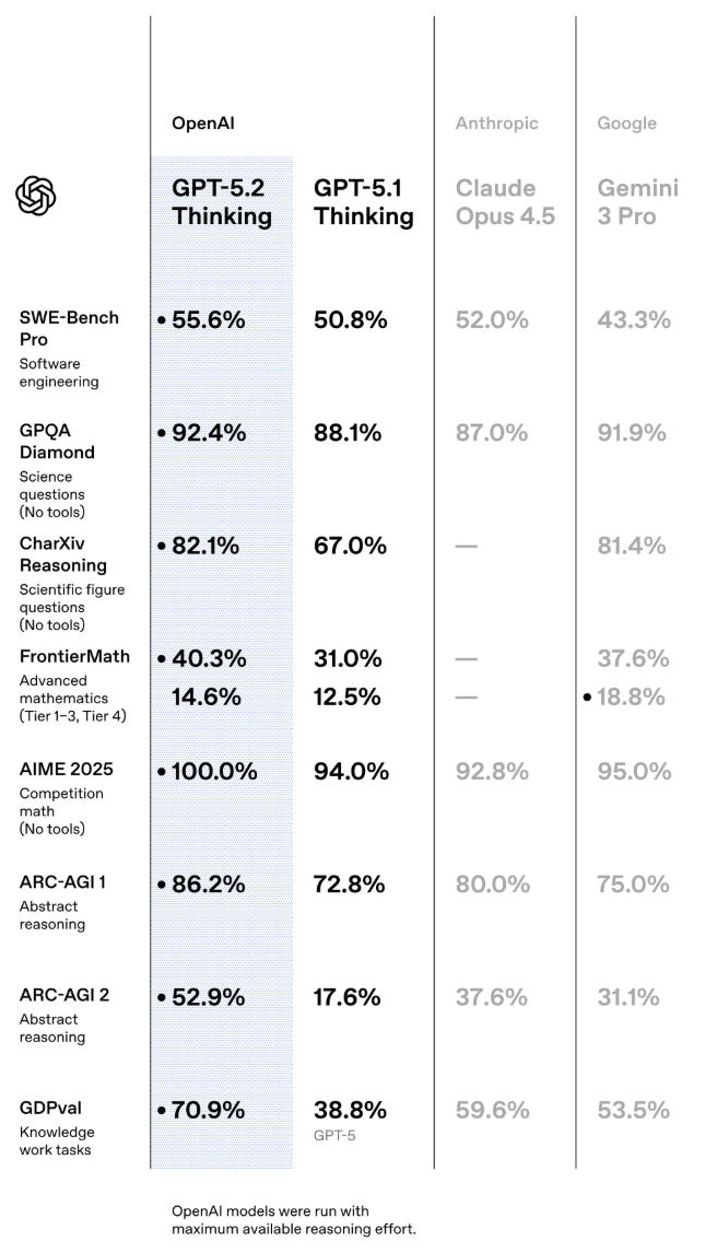 GPT-5.2 Thinking在几乎所有列出的推理测试中都略胜于Gemini 3和Anthropic的Claude Opus 4.5