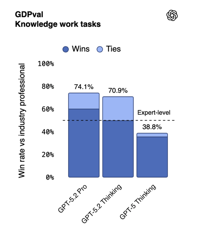 在评估涵盖44个职业的知识型工作任务的GDPval测试中,有70.9%的对比结果优于或持平于顶尖行业专业人士