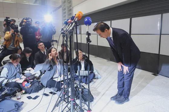 11日,当时尚未正式辞职的韩国海洋水产部长官田载秀在仁川国际机场就“统一教贿赂风波”表态(《韩民族日报》网站报道配图)
