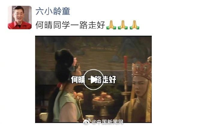 据中新网,14日,六小龄童对记者表示:何晴是他在浙江昆剧团学员班学艺时的小班同学。何晴深谙昆曲,会戏甚多。尤其在日后从事的影视艺术中收获颇盛,观众都称她“怜怜姐姐” (央视版《西游记》中她饰演的角色)。她是唯一演遍“四大名著”的女演员,成就非凡。“我们永远怀念她。天堂没有病痛,何晴同学一路走好!”
