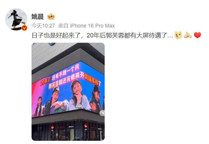 姚晨配文感叹道:“日子也是好起来了,20年后郭芙蓉都有大屏待遇了……”不少网友在评论区中用《武林外传》经典台词来回复:“佟掌柜说得对,‘二十年快得很,弹指一挥间’。”