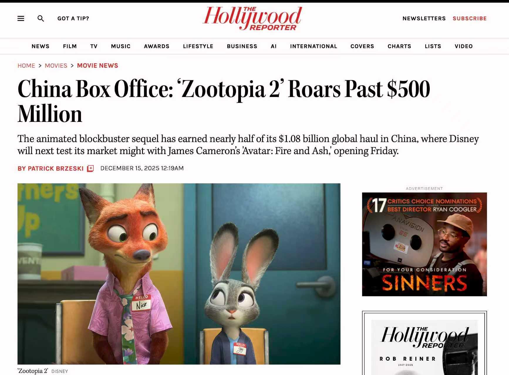 《好莱坞报道者》在市场观察中同样指出,《疯狂动物城2》在中国的票房已超过5亿美元,并提到中国票房占其全球总收入的比例接近一半,凸显中国市场对其“全球爆款表现”的决定性影响。报道同时观察到,中国市场展现出的“跨年龄层广泛观影能力”,表明其已发展成为一个更加成熟、审慎且容量巨大的电影消费市场。