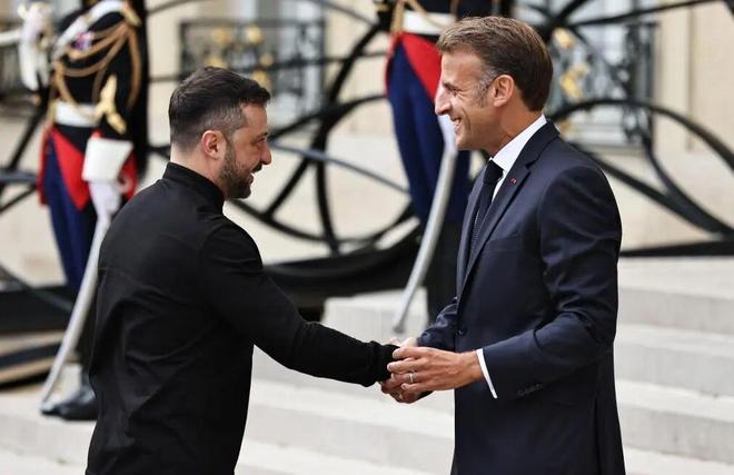 9月4日,在法国首都巴黎的总统府爱丽舍宫,法国总统马克龙(右)迎接出席“志愿联盟”线上会议的乌克兰总统泽连斯基 图:新华社