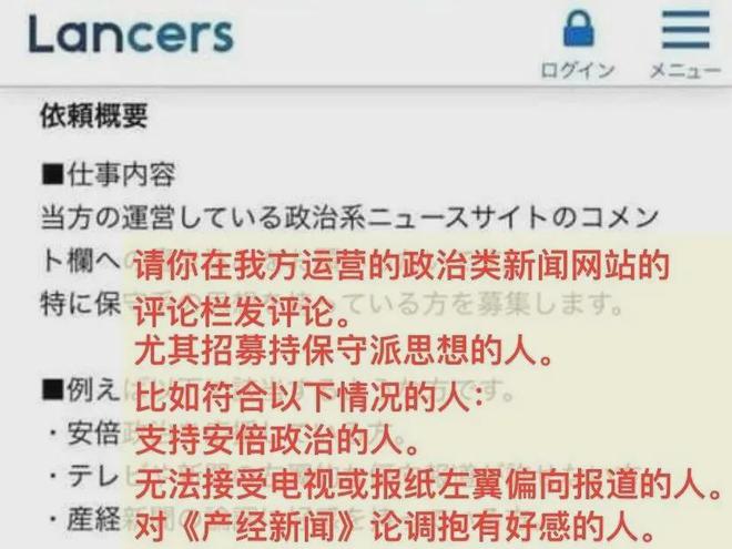 CrowdWorks并非个例。日本另一大型众包平台Lancers上也曾出现类似招募信息,要求给保守派运营的政治类新闻网站撰写留言跟帖,招募对象需“支持(前首相)安倍(晋三)政治”“无法接受电视或报纸左翼倾向报道”“对(右翼媒体)《产经新闻》论调抱有好感”等。
