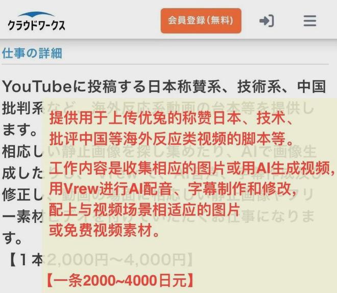招募方要求制作者收集视频素材或利用人工智能(AI)生成素材,完成配音、剪辑等加工,最终视频要突出“日本技术、日本文化、日语的优秀之处”,展示所谓“中国人的扰民行为和不文明举动”等,每条视频报酬为2000至4000日元(约合90至180元人民币)。