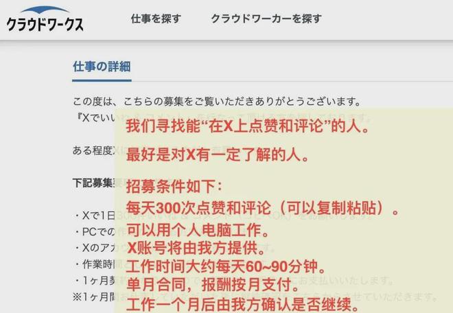 在CrowdWorks平台上,除了内容制作的招募信息,还有人发帖招人点赞、评论、转发。比如,日本网民分享的一条招募信息截图显示,发包者要求接单者每天在社交媒体上点赞和评论300次,评论可以简单“复制粘贴”。