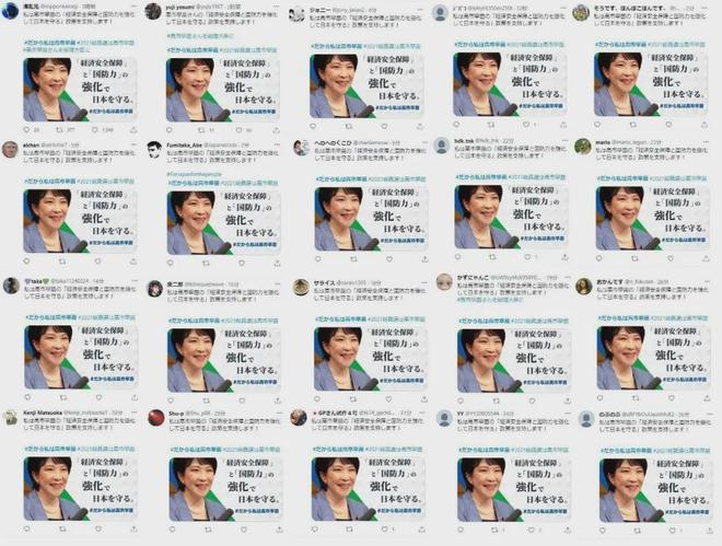 日本社交媒体平台充斥如“当然只能支持高市早苗”“高市早苗拜托了”等内容相似的帖文。