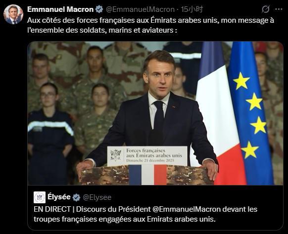来源:环球时报【环球时报驻法国特约记者 邵琦】当地时间21日,法国总统马克龙在位于阿联酋阿布扎比、毗邻霍尔木兹海峡的法国... 来源:环球时报