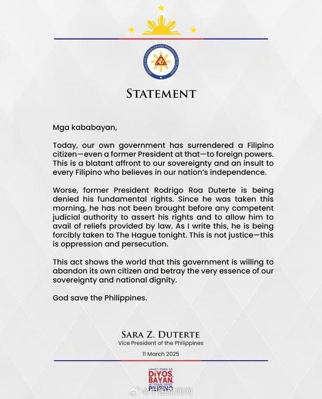 菲律宾副总统莎拉·杜特尔特3月11日晚在社交媒体发表声明说,菲现政府基于国际刑事法院逮捕令而拘留其父亲、前总统杜特尔特的... 菲律宾副总统莎拉·杜特尔特3月11日晚在社交媒体发表声明说,菲现政府基于国际刑事法院逮捕令而拘留其父亲、前总统杜特尔特的行为公然侮辱了菲律宾主权。