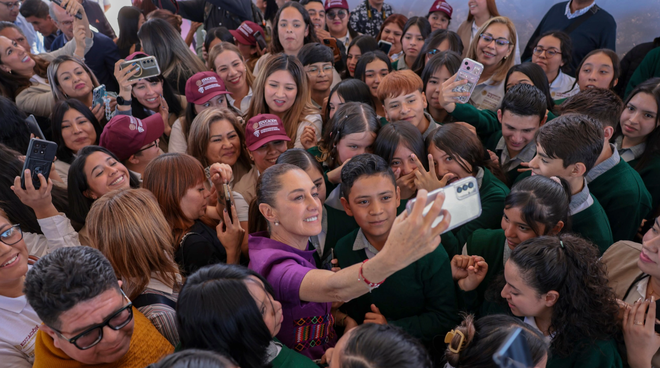 辛鲍姆与民众自拍当地时间3月9日,墨西哥总统克劳迪娅·辛鲍姆在首都墨西哥城的市中心佐卡洛广场进行公开演讲。聆听演讲的群众... 辛鲍姆与民众自拍
