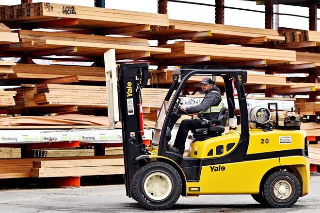 3月4日,加拿大不列颠哥伦比亚省一家木材供应商的工人在操作叉车。木材是美国对加拿大征收关税的商品之一(图/路透社)
