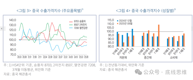 按中国海关和其他的官方数据,中国的出口价格指数,按照重要品目(乘用车、二次电池、热轧钢板),和性质(资本财产、中间财产、消费财产)区分,与资本财、中间财相比,为刺激消费,而直接降价的趋势较为明显。但在报告中没有体现的是消费端的数据,是否包括了补贴。