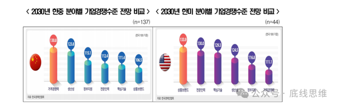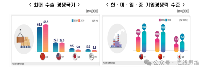 具体看调查结果的话,被问及当前最大的竞争对手时,62.5%的韩企回答是“中国”,数量远超回答美国(22.5%)和日本(9.5%)的企业。如果将时间设定为2030年,回答“中国”的韩企比例还进一步提升到了68.5%。这其实意味着多数韩企认为,现有的世界产业格局不会发生大的变化,美国和日本曾经的技术优势,将会一直缓慢流失。