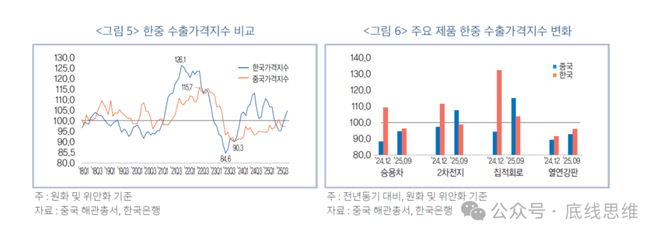 韩中的出口价格指数高度相关,既是全球大势使然,也一定程度上说明韩国高度依赖中国的市场和供应链。说到具体措施,报告认为:一是在中国出口价格降幅较大的消费品领域,在质量和品牌方面与中国产品采取差异化竞争策略;二是在资本财和中间财行业,利用供应链内的相互依赖性与客户维持稳定的交易关系,比打价格战更为有效。但报告也承认,中国政府近乎苛刻的新的电动车标准,可能会刺激中国汽车企业出现新一轮的技术大爆发。