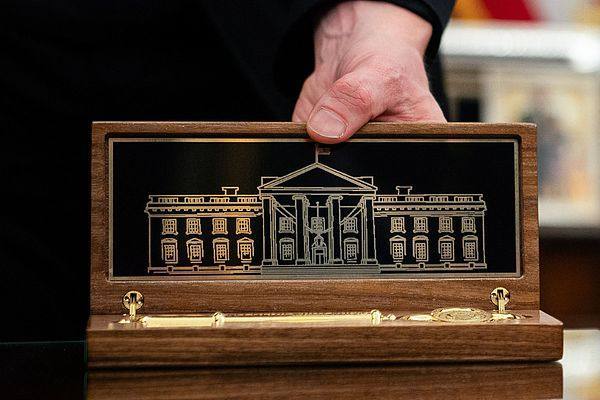 从公开的照片可以看到,装有钥匙的木盒上雕刻有白宫图案及特朗普的亲笔签名,钥匙则被刻上了“KEY TO THE WHITE HOUSE”(白宫钥匙)的字样。报道称,这把钥匙由特朗普亲自设计,专门用于赠予他视为“特别客人”的外国政要或知名人士。