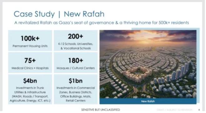 其中一张题为“新拉法”的幻灯片将其设想为加沙的“施政中心”,并容纳超过50万居民。他们将生活在一座拥有超过10万套住房、200所以上学校、超过75个医疗设施以及180座清真寺和文化中心的城市里。