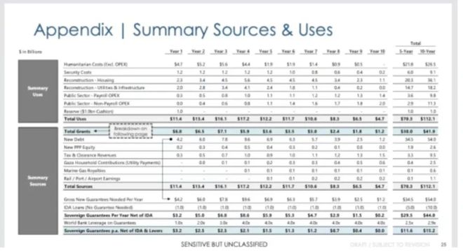该计划估计,包含公共部门薪资在内,十年内整个项目将耗资1,121亿美元,初期资金多用于人道主义需求。在此期间,将有近600亿美元通过赠款(419亿美元)和新债务(152亿美元)筹措,美国将提供“支柱性”支持,承担20%或更多的资金。世界银行也将在融资中发挥作用。