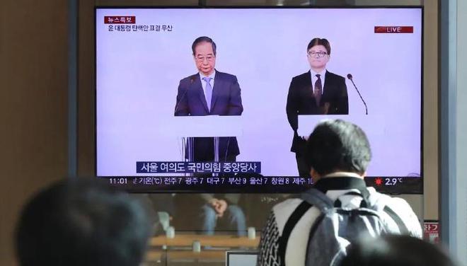 12月8日,在韩国首尔火车站,民众观看韩国执政党党首韩东勋与国务总理韩德洙(左)共同会见记者的电视直播。记者 姚琪琳 摄/新华社