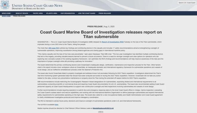 综合新华社等媒体(2025年)8月5日报道,美国海岸警卫队5日发布2023年6月“泰坦”号深海潜水器爆炸事故调查报告。这份300多页的调查报告概述了事故的关键调查结果、事故主要成因以及其他因素。