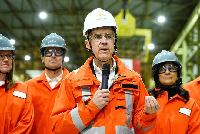 即将上任的加拿大新总理卡尼12日视察钢铁厂。当天,美国对所有进口钢铁和铝征收25%关税的举措正式生效(图/视觉中国)