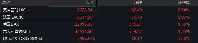 欧股方面,欧股主要指数也集体上涨,截至发稿,英国富时100指数涨0.94%,法国CAC40指数涨0.97%,德国DAX指数、意大利富时MIB指数、欧元区斯托克50指数涨幅均超过1%。