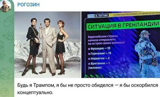 罗戈津调侃称,这反映出欧洲国家其实认为美国比俄罗斯“弱500倍”,还认为美方“会在这30个斯巴达勇士面前退缩”。他还说:“每2个挪威人和13个德国人,就派一个英国人。一个人。没有替补,没有增援。可能只带着保温瓶和责任感。或者也许是詹姆斯·邦德和他的女郎们?……总之,这对特朗普来说是耻辱,对邦德来说很开心。”