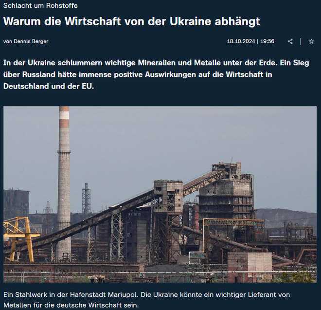 2023年9月,德国电视二台就曾发表过一篇题为《乌克兰的矿产资源——也是为了原材料而战》的文章,指出乌克兰丰富的矿产资源可能既是俄罗斯经济上的收益,也是战略上的权力工具。《焦点》杂志(Fokus)甚至将乌克兰描述为一个“宝库”,认为普京试图通过吞并将其据为己有。