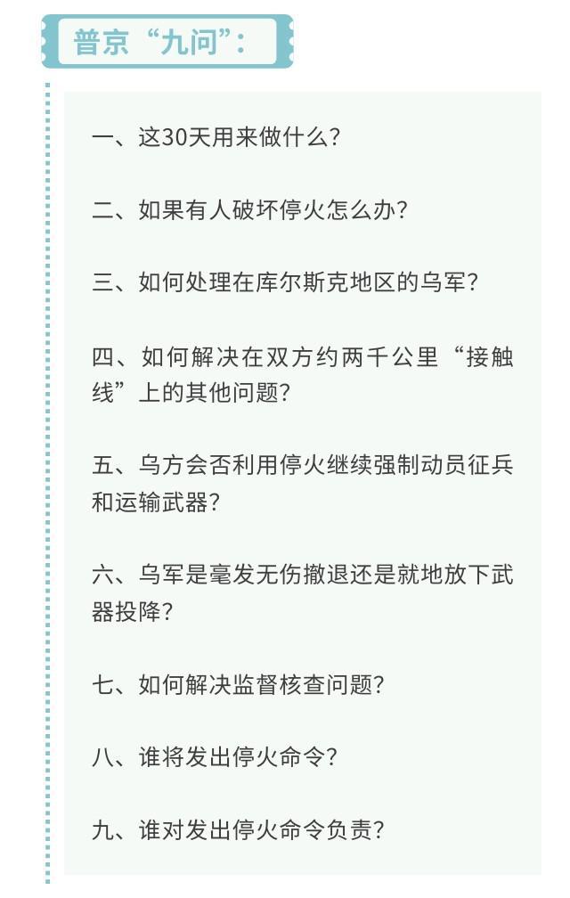 3月14日,普京表示俄罗斯同意停火30天,但提出了九大问题。