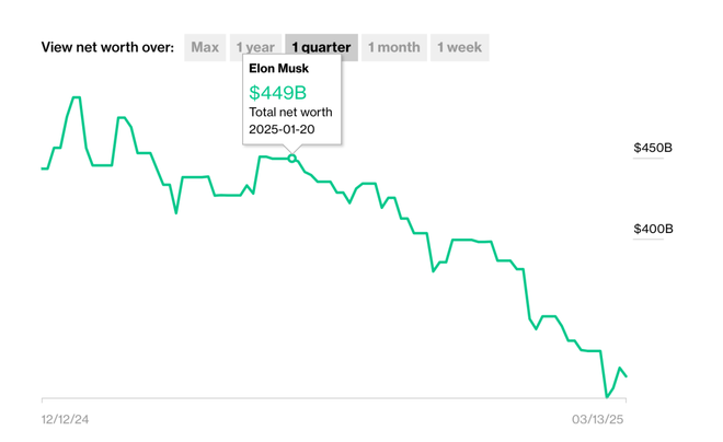 自1月20日特朗普就职典礼以来,根据彭博亿万富翁指数,马斯克的个人财富净值缩水1350亿美元(约合人民币0.98万亿元),最新身家为3140亿美元(约合人民币2.3万亿元)。