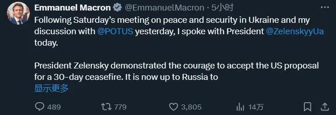 17日,法国总统马克龙在社交媒体X平台发文,透露乌克兰总统泽连斯基当日早些时候与自己通话,称泽连斯基表现出了接受美国提出的30天临时停火协议的“勇气”。