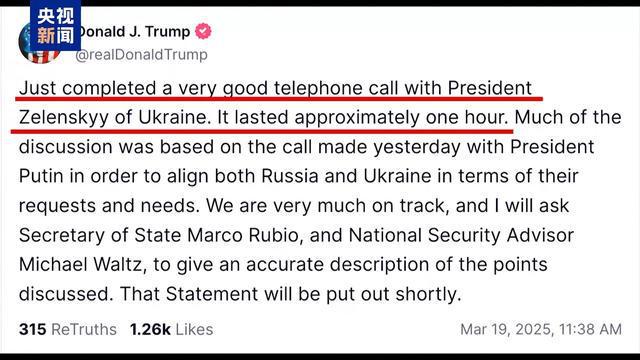 特朗普19日在社交媒体上发文称,此次通话持续大约一个小时,谈得“非常好”。泽连斯基也在社交媒体上发文,用“积极、非常实质和坦诚的对话”定义此次通话。