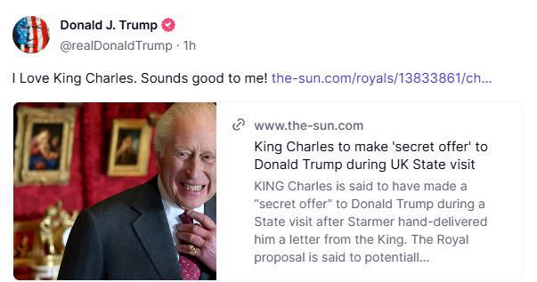 特朗普21日在社交平台发文转发《太阳报》上述报道并回复称,“我爱查尔斯国王。听起来不错!”