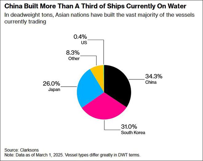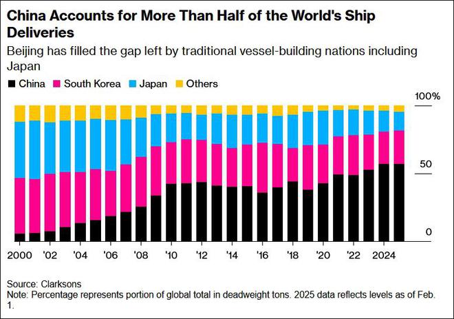 中国生产世界上超过一半的货运船舶 彭博社制图