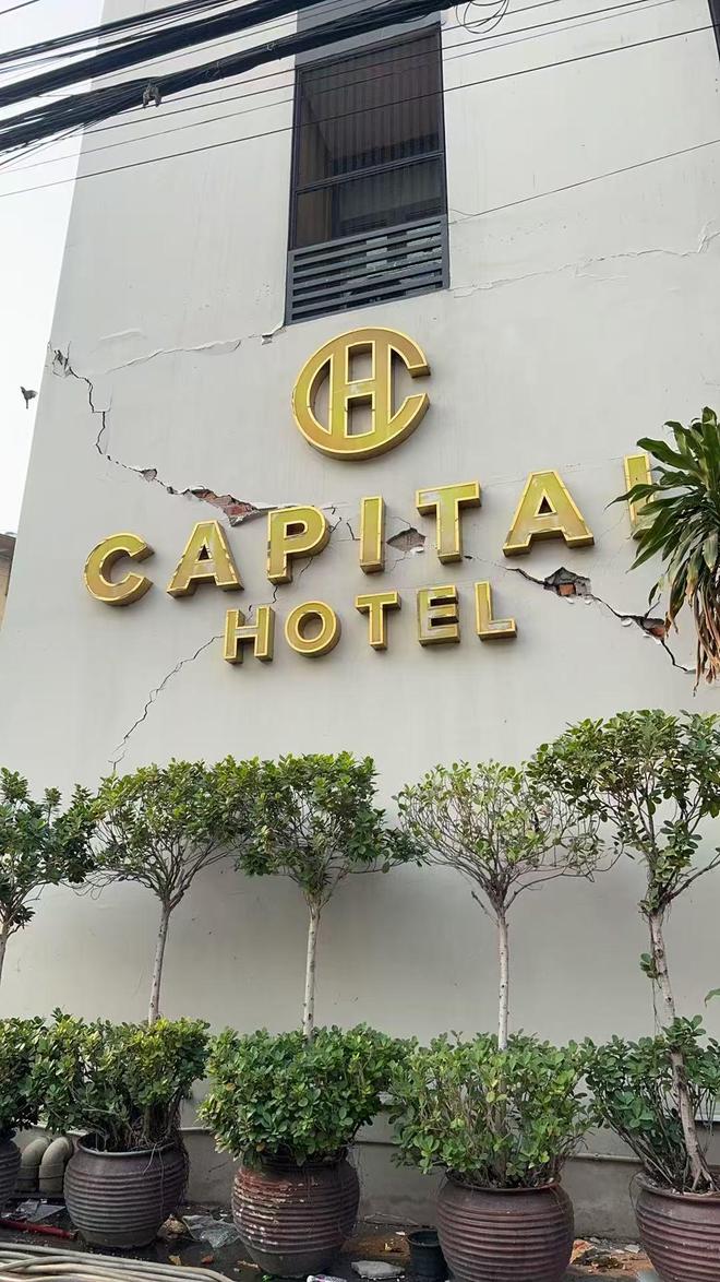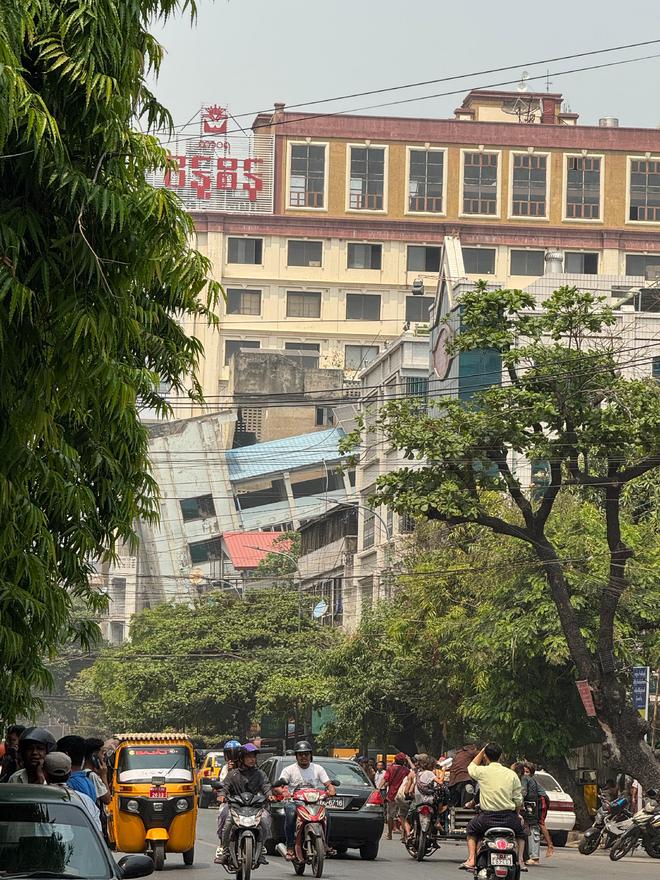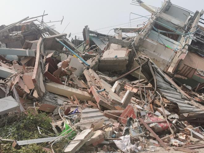 街上已经一片混乱,目之所及,有正在修建中的楼房被震到完全变形,马路旁的电线杆横斜着倒在地上,更远处的红色楼房几乎每一扇玻璃窗都被震碎,一栋原本七八层的房屋被整个掀翻在地。他所处的位置位于缅甸曼德勒市最大的玉石交易市场——角湾市场,房顶的铁皮也被震烂。
