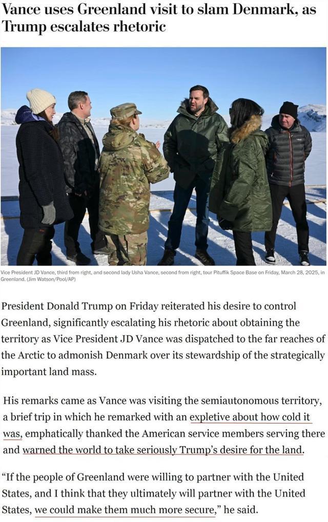 万斯当天在岛上一边抱怨当地天气寒冷,一边大肆批评丹麦政府在格陵兰岛的防务等方面投资不足,同时告诫世界要“认真对待”美国总统特朗普对这片土地的渴望。