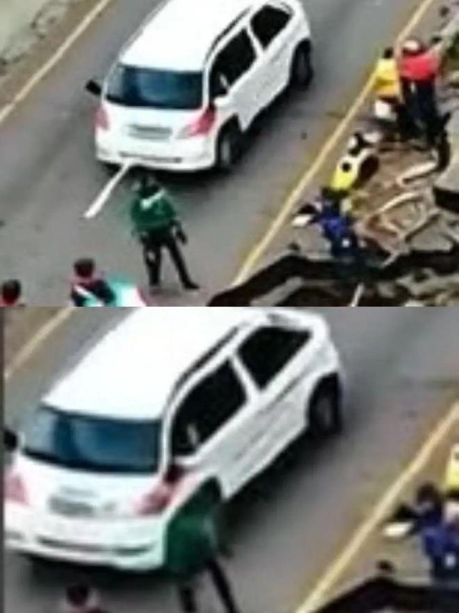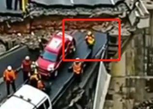 同理,网传第二段视频中也有几处不合常理的迹象,比如,视频第1秒至第6秒处,一名救援人员在没有任何救援车辆和工具辅助下,徒手将路面和路面上的车抬了起来。