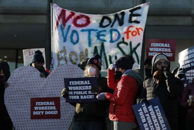 当地时间2025年2月14日,抗议者在美国卫生与公众服务部总部外示威,支持联邦工作人员,表达对美国政府效率部削减预算的不满