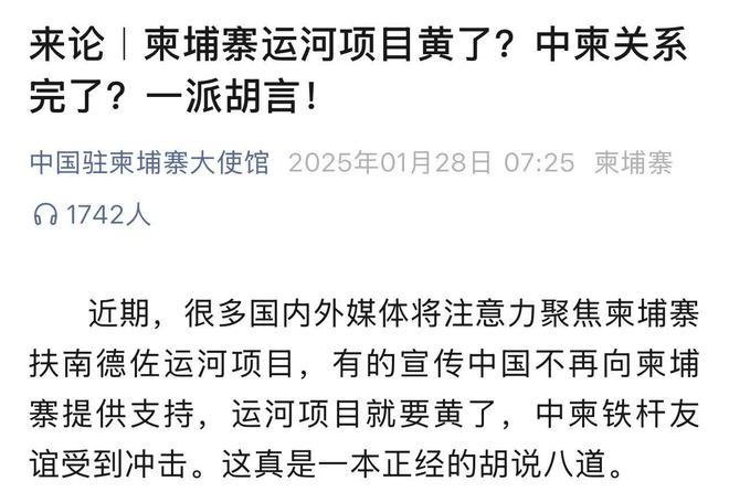 1月28日,中国驻柬埔寨大使馆微信公众号发表文章《来论|柬埔寨运河项目黄了?中柬关系完了?一派胡言!》,全文如下: