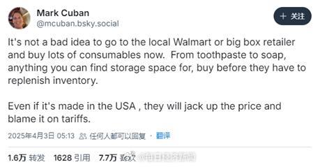 当地时间4月2日下午,美国知名投资人、亿万富翁马克·库班在社交平台写道:“从牙膏到肥皂,凡是能找到地方可以储存的东西,都应该趁早买起来,最好是在商店补货前购买。”库班强调,即使是美国货,也有可能涨价,“他们会甩锅给关税”。