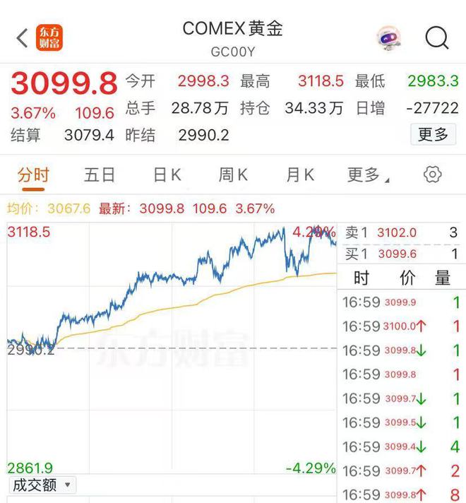 COMEX黄金大涨3.67%,报收3099.8美元/盎司。