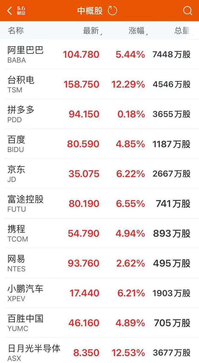 理想汽车涨6.82%,京东涨6.22%,小鹏汽车涨6.21%,腾讯音乐涨5.51%,阿里巴巴涨5.44%,蔚来涨5.41%,新东方涨4.15%,拼多多涨0.18%,好未来跌1.33%。