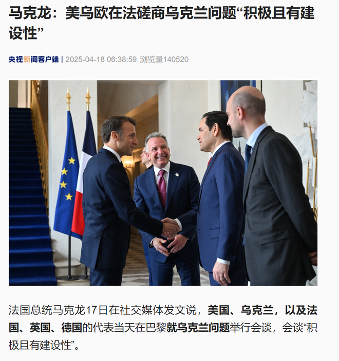 马克龙当天会见了到访的美国国务卿鲁比奥。鲁比奥当天同乌克兰、法国、英国三国外长,以及德国外交部官员举行了会议,磋商乌克兰问题。
