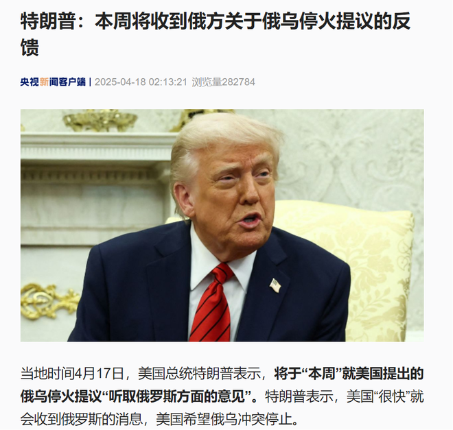 当地时间4月17日,美国总统特朗普表示,将于“本周”就美国提出的俄乌停火提议“听取俄罗斯方面的意见”。
