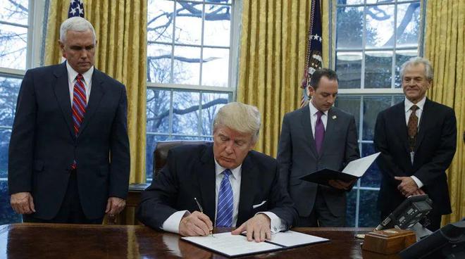 当地时间2017年1月23日,美国华盛顿,美国新总统特朗普在白宫签署行政命令,正式宣布美国退出跨太平洋伙伴关系协定(TPP) 图:国际在线