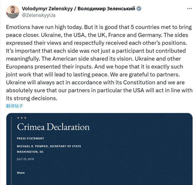 紧接着,泽连斯基在贴文中附上了2018年美国时任国务卿迈克·蓬佩奥签署的“克里米亚宣言”,宣言中把克里米亚称为“被强行占领”土地。蓬佩奥任美国国务卿时,也是特朗普的第一个总统任期。