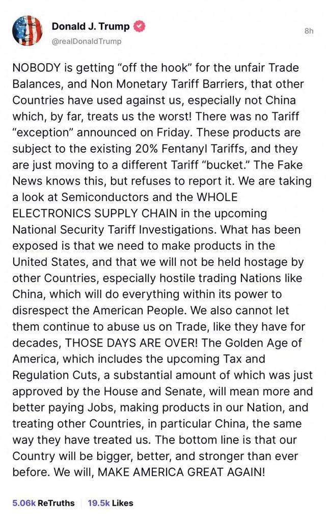 然而仔细看,特朗普这个帖子其实什么新内容也没有,在他之前,商务部长卢特尼克周日已经表示对半导体等电子产品免除关税“是暂时的”,一两个月后将会出台半导体行业关税。特朗普指责中国“对待我们(美国)的方式是最糟糕的”,表示20%的芬太尼关税将转移到其他的“关税桶”中,这一转移卢特尼克也已经说了。对于市场最关心的美国是否已经免除了中国电子产品125%的“对等关税”,以及如果现在免除了,半导体行业关税出台时会不会又加回来,特朗普回避了,之前卢特尼克也没有说清楚。