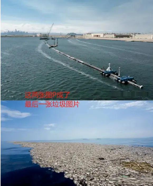 据环球网报道,图片的左半部分是美联社照片,展示的是在美国加州组装的用于收集太平洋塑料垃圾的一种浮动围栏装置,右半边的图片则属法新社所有,是鲍尔拍摄的位于洪都拉斯附近加勒比海域的垃圾带组图中的另一张。换句话说,这是一张P图!