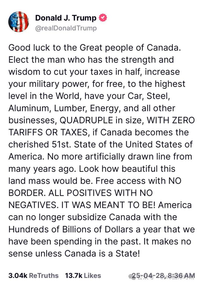 美国总统特朗普对包括加拿大在内的多国挑起贸易战,并多次公开表示加拿大应该成为美国的“第51个州”。就在4月28日加拿大联邦众议院选举当天,特朗普还再提“吞并”加拿大一事,鼓动加拿大成为美国的“第51个州”。