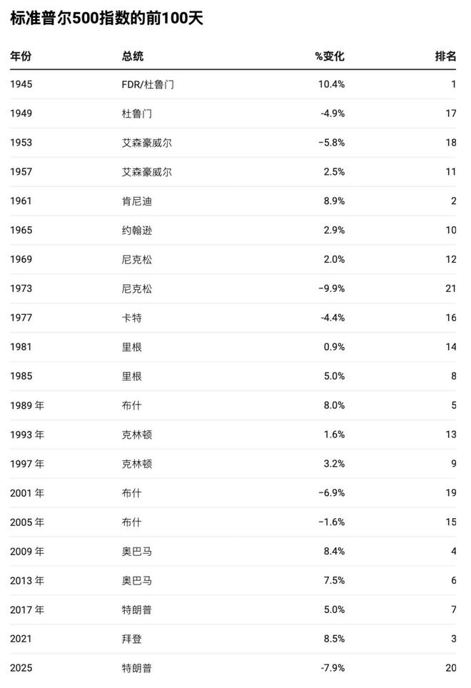 标准普尔500指数从1月20日特朗普宣誓就职到4月25日收盘,跌幅为7.9%,这是尼克松第二个总统任期以来,历任美国总统任期前100天的第二糟糕表现